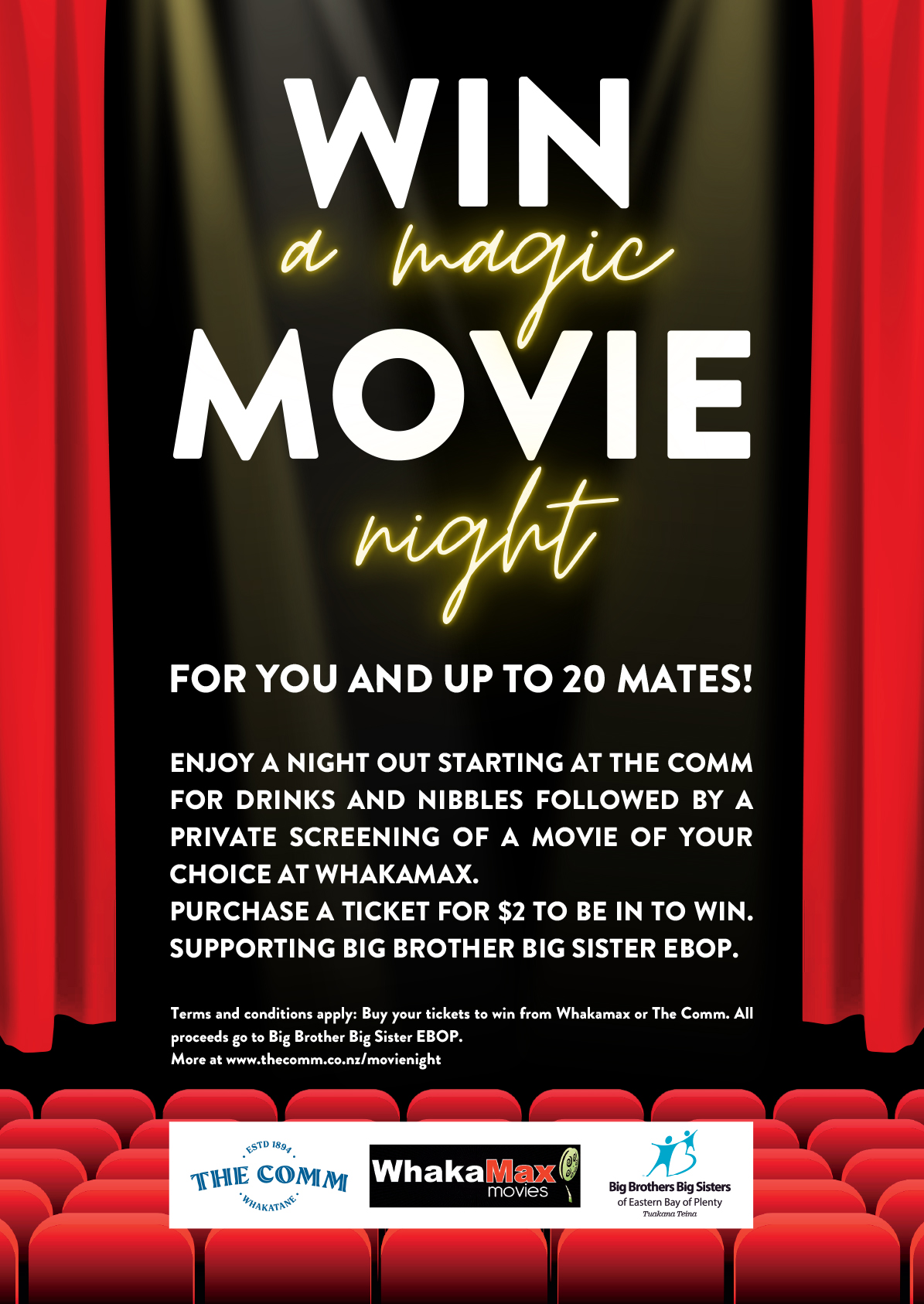 - The Prize consists of a private movie theatre at Whakamax with the movie of your choice for 20 people. With a drink for each person and platters at The Comm.